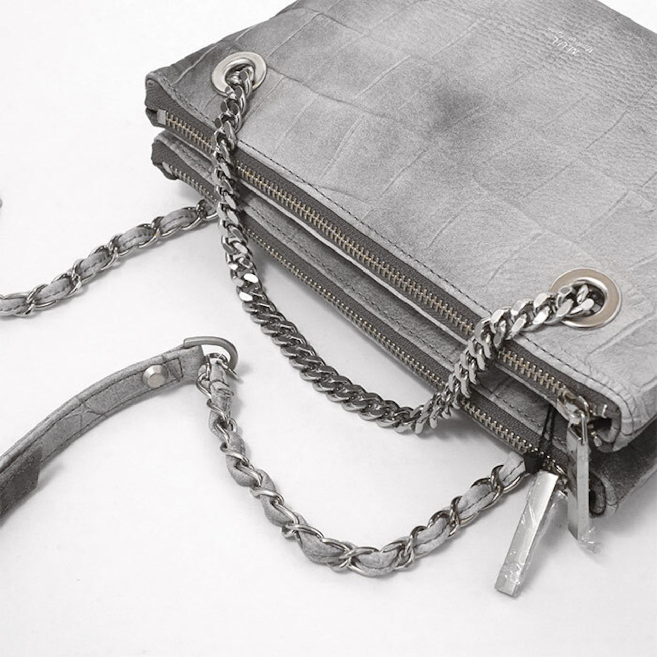 白く染めたクールなヌバックの革面にあえて黒の塗料で濃淡を表現した、モノトーンのシックなニュアンス。目を惹く滑らかなシルバーチェーンは「大人の普段使い」にふさわしい重厚感で圧倒的存在感を放ちます。