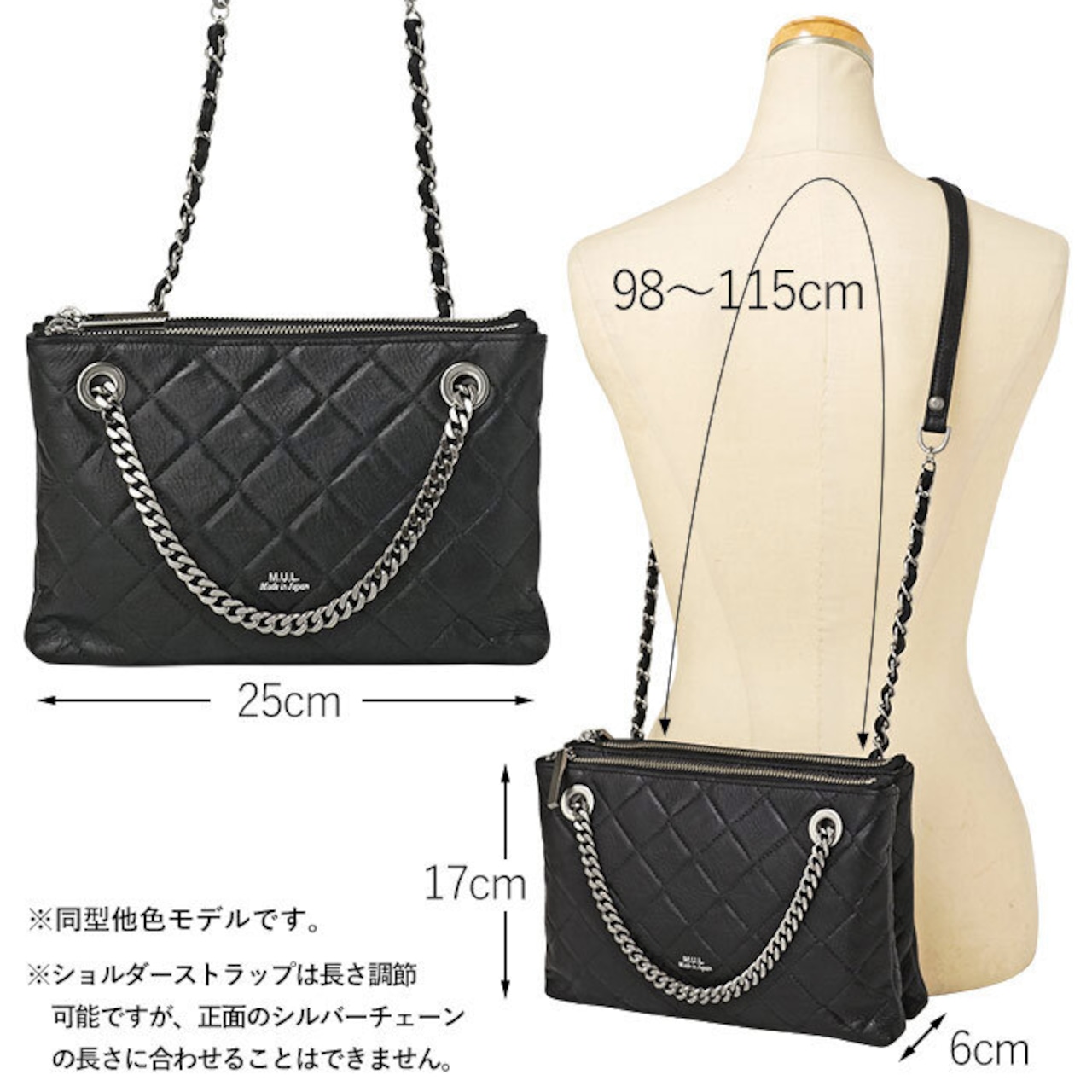 ※背胴側のショルダーストラップは調節可能ですが、フロントの装飾チェーンと長さを合わせることはできません。