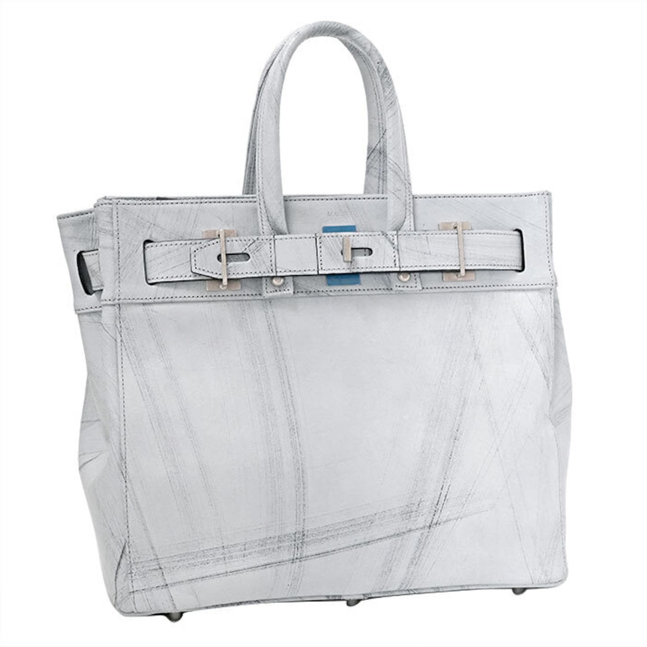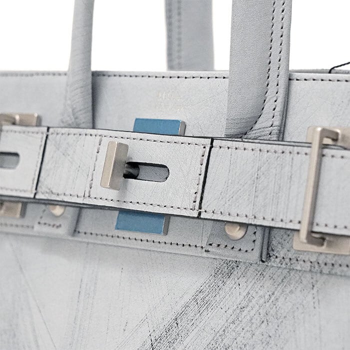 クールでシックなホワイトカラーがベース、近付くと分かる程度に施したスクラッチは繊細で且つ直線的、ダメージ加工と言っても白がベースだからハードではなくあくまで上品指向です。