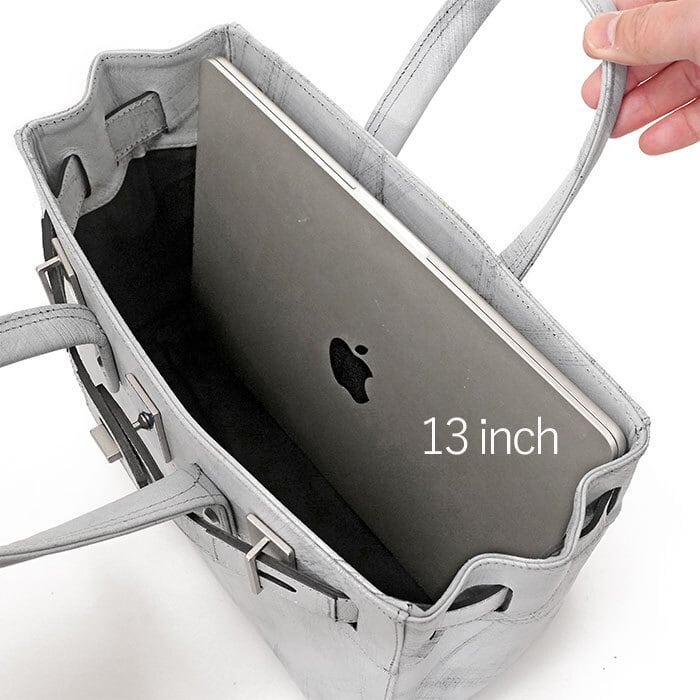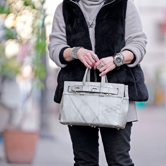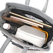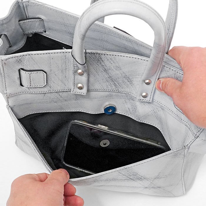 このコレクションからフロントのベルト構造がアップグレードされたスタッドトート。ベルト穴と中央留め具を使ってタイトorルーズに開口部を2段階調節することができ、容量や見た目で変化がつけられます。